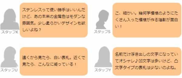 ステンレス+COLOR表札ステンレスの良さとモダンなデザインを取り込んだ近未来型の表札がたくさん!たくさんの模様やモチーフがあり、ファブリックパネルのように壁を飾る表札です。モダンアートなサインプレートを玄関に取り入れて、ちょっとコジャレ感を演出!