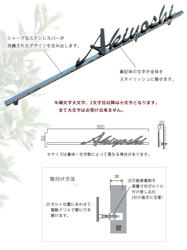 流れるような文字がスタイリッシュなステンレスの表札「グラフィアAタイプ」モダンでオシャレなネームサインです
