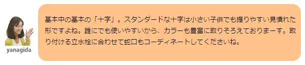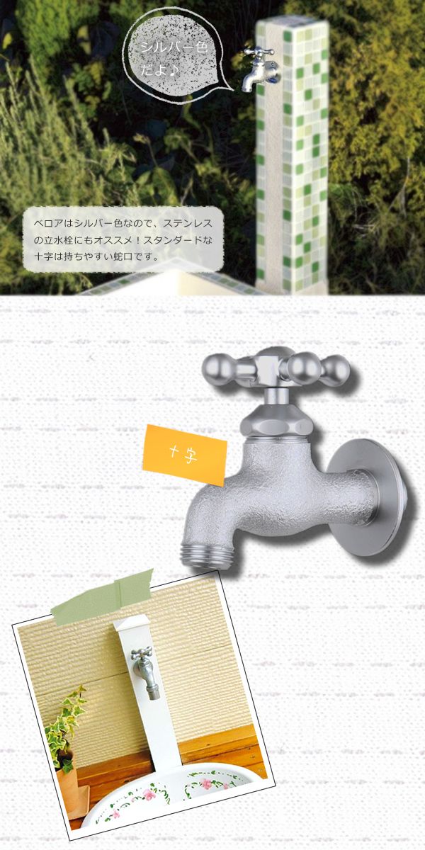 小さなお子様でも握りやすい形状の十字ハンドルは使いやすさ抜群です。ベロアはシルバー色なので、ステンレスなどモダンな水栓柱にオススメです。