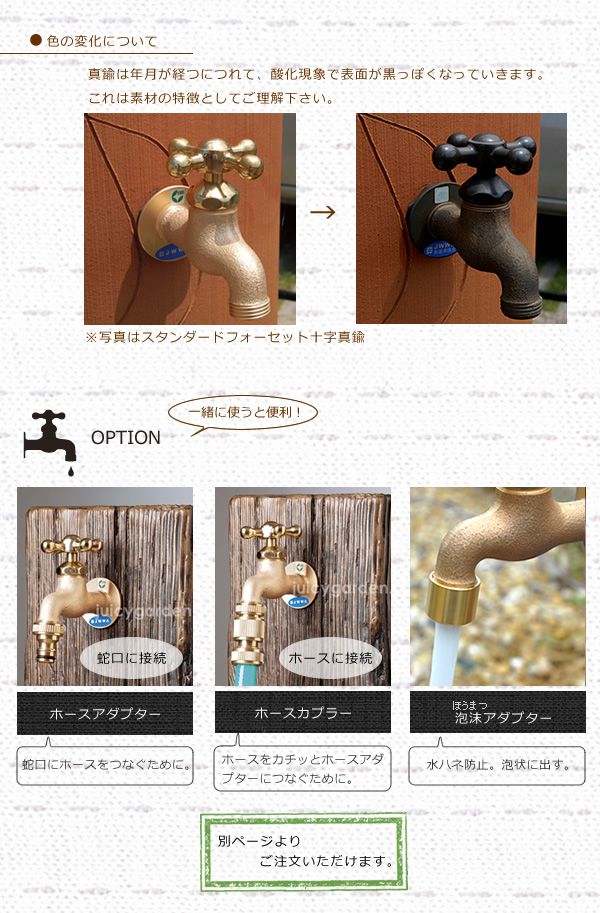 ベロアはシルバー色なので、ステンレスなどモダンな水栓柱にオススメです。 白い立水栓に合わせても綺麗ですよ。 シンプルな蛇口は、日本製で輸入品のように水漏れの心配なし! 飲料水用としても使用できる機能性や安全性を重視して鉛低減処理済み、JWWA(日本水道協会)新基準適合商品です。 パッキンもお近くのホームセンターで買えるから安心です(JIS用コマ13mm) ※真鍮は使用するにつれて落ち着いた色に変わってきます。 ※ホース接続にはアニマル蛇口専用ホースアダプターが必要です。 ※寒冷地仕様ではありません。