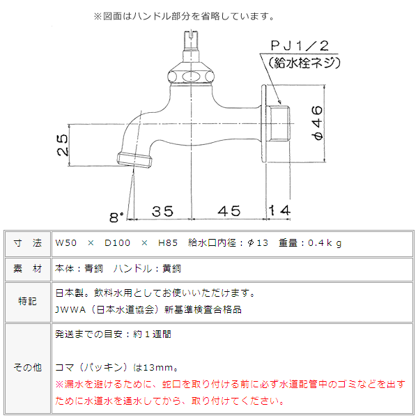 クロムは、落ち着いた黒っぽいカラーなので、和風・和モダンの住宅にもお薦めです。 陶器や枕木などを和の庭に仕立てる時にぜひご利用ください。 シンプルな蛇口は、日本製で輸入品のように水漏れの心配なし! 飲料水用としても使用できる機能性や安全性を重視して鉛低減処理済み、JWWA(日本水道協会)新基準適合商品です。 パッキンもお近くのホームセンターで買えるから安心です(JIS用コマ13mm) ※真鍮は使用するにつれて落ち着いた色に変わってきます。 ※ホース接続にはアニマル蛇口専用ホースアダプターが必要です。 ※寒冷地仕様ではありません。