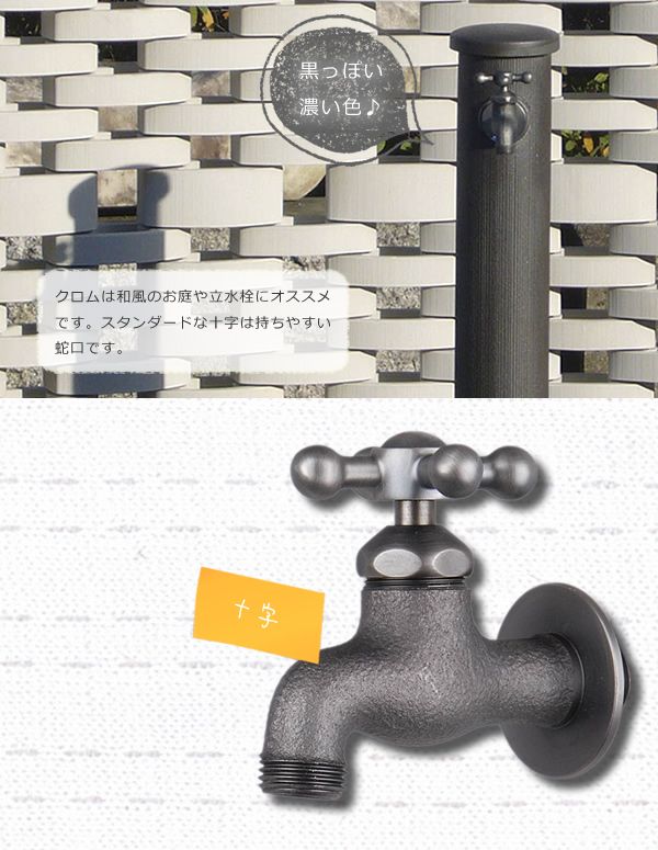 小さなお子様でも握りやすい形状の十字ハンドルは使いやすさ抜群です。クロムは落ち着いた黒っぽいカラー。和風のお庭にもオススメ。立水栓 水道 水周りに。