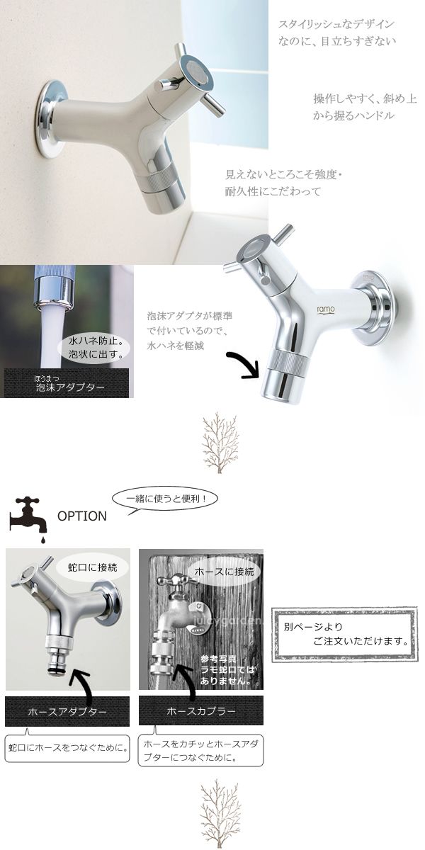 イタリア語で「枝」を意味する「ramo」。 使いやすい形と、意外とコンパクトな姿です。 標準で泡沫アダプタが装備されているので、水が飛び散らずエコですね! 泡沫アダプタとは水の飛び散り防止の金具で、水が泡のように、なめらかに出てきます。 寒冷地仕様で、凍害地域使用可能です。 但し、寒冷地でご利用の際には、必ず水抜きをして下さい。 JWWA(日本水道協会)新基準適合商品です。 ※銅製品のため、年月と共に、酸化現象で表目が黒っぽく変化したり、緑青が出て重厚な風合いが味わえます。これは素材の特徴としてご理解下さい。 ※ホース接続にはramo蛇口専用ホースアダプターが必要です。