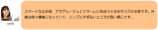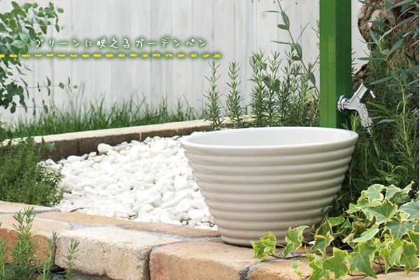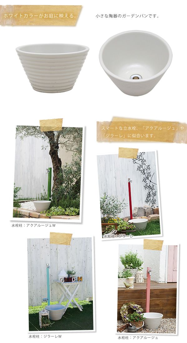 小さな陶器製ガーデンパンです。 モダン、レトロ、ナチュラルなど、どんな雰囲気にも似合うホワイトカラー。 スリムな水栓柱「アクアルージュ」や「フラワールージュ」、「ジラーレ」に似合います。 ●ガーデンパン単体のご注文ページです。 ●排水口金具付属。 ※水道工事、取り付け工事は指定水道工事店にご依頼ください。