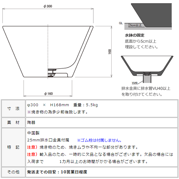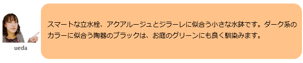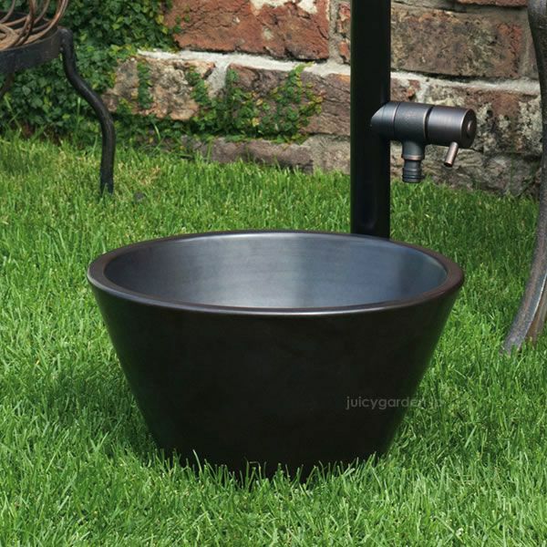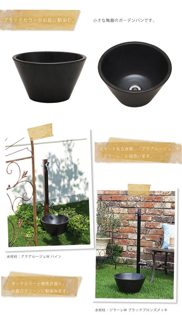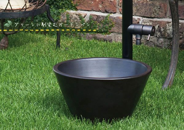 小さな陶器製ガーデンパンです。 シックなカラーの水栓柱に似合うブラックカラー。 スリムな水栓柱「アクアルージュ」や「フラワールージュ」、「ジラーレ」に似合います。 ●ガーデンパン単体のご注文ページです。 ●排水口金具付属。 ※水道工事、取り付け工事は指定水道工事店にご依頼ください。
