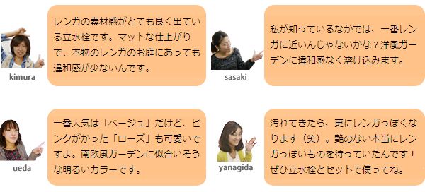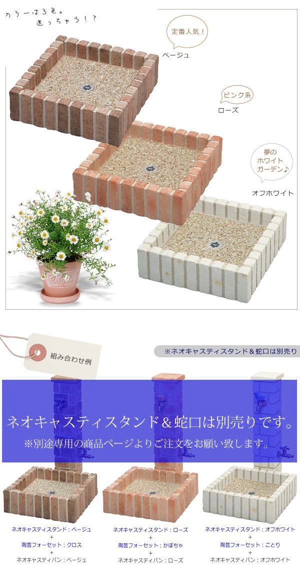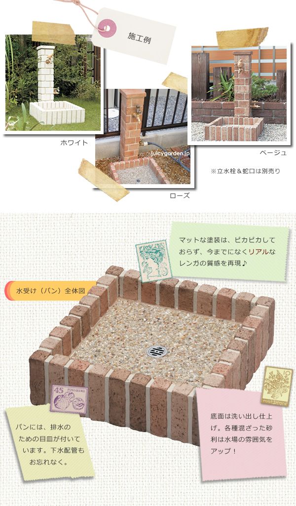 あたたかなレンガの表情を持ったスリムサイズの立水栓「ネオキャスティスタンド」とお揃いの水受けが「ネオキャスティパン」です。現場でレンガを積み上げて施工するより低コストなのも魅力です。