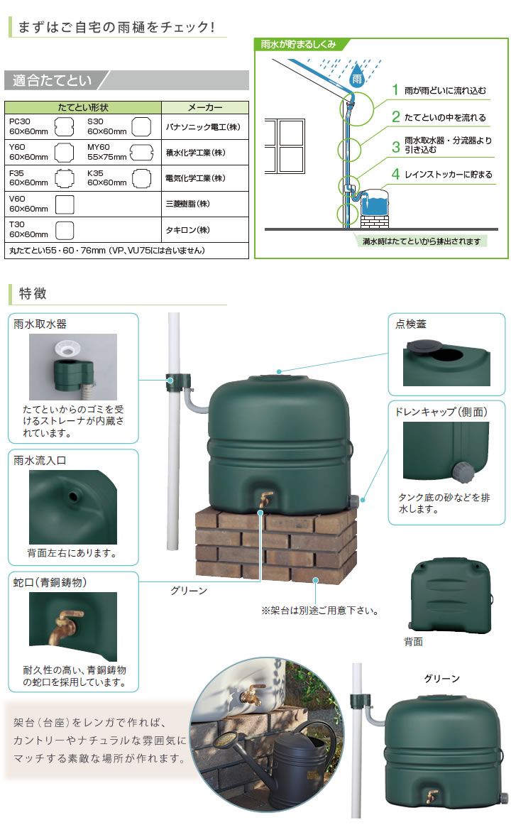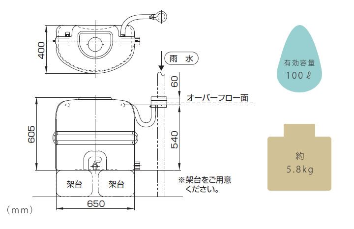 ※容器自体には110L入りますが、オーバーフロー時には雨樋に戻しますので、その位置までの有効容量は100Lです。