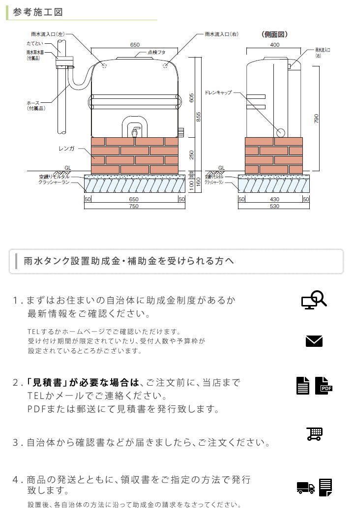 購入前に、是非お住まいの市町村のホームページや役所で「雨水タンク 助成金」などでお問い合わせください。