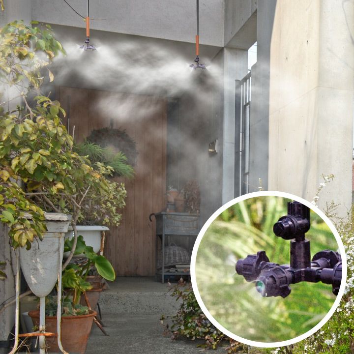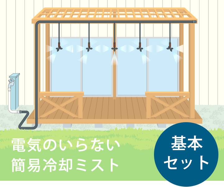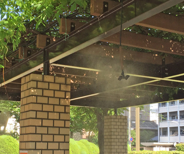 上からノズルをぶら下げて散水するタイプで、庇(ひさし)やパーゴラなどに設置し散水することで、気化熱による周辺の冷却が行えます。