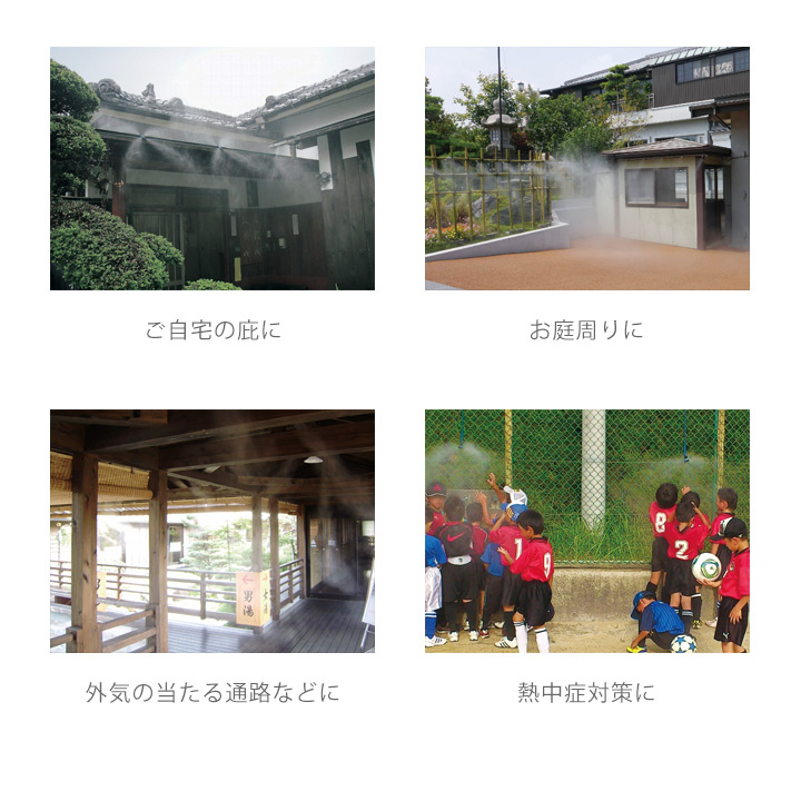 気化熱によって気温や体感温度が下がるだけでなく、水の冷たい粒子と霧のカーテンによって見た目にも涼しげな景色が楽しめて、快適な雰囲気になります。