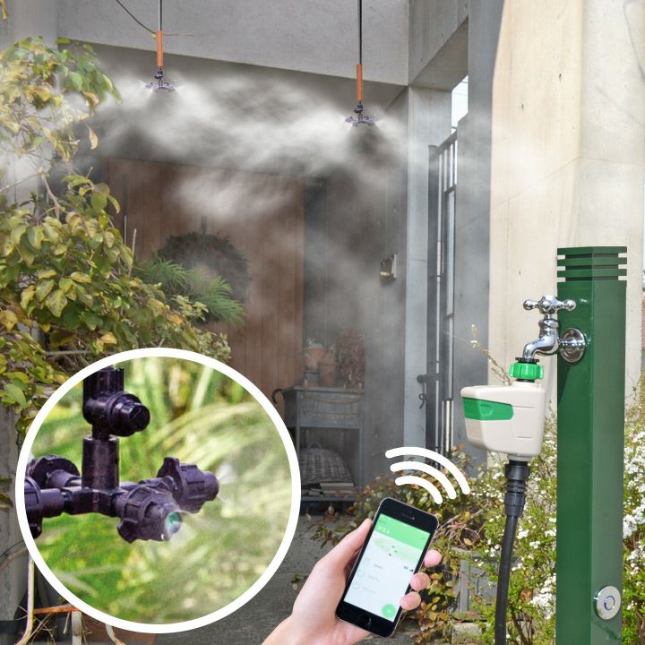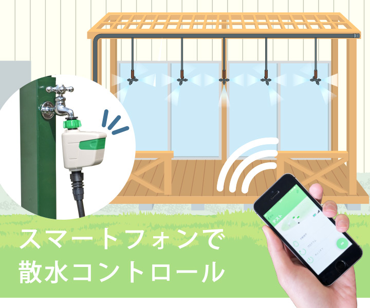 「スマプロBT」と併用することでスマートフォンを使った散水コントロールが可能になり、毎回蛇口をひねることなく遠隔操作でミスト散水のON/OFFが行えます。