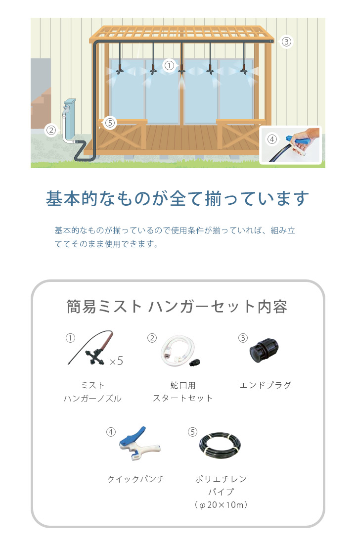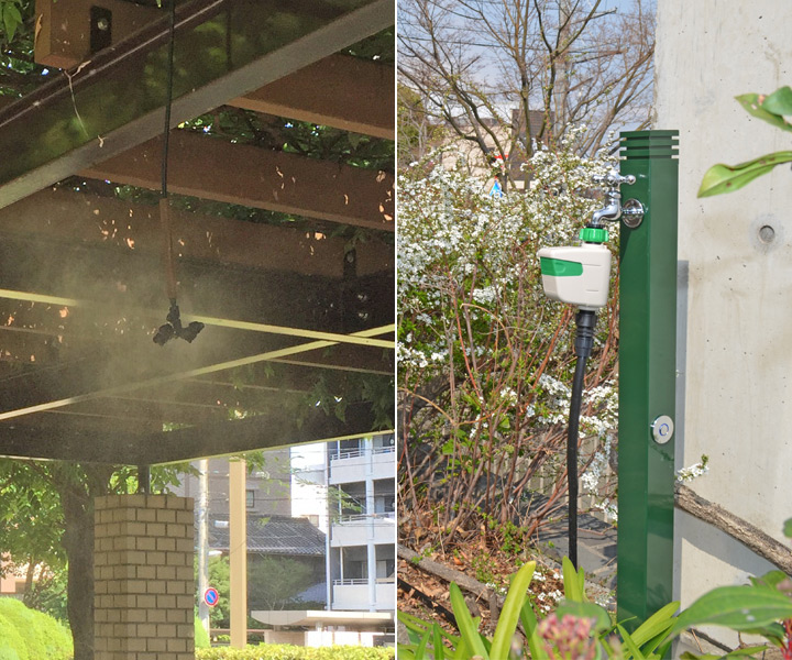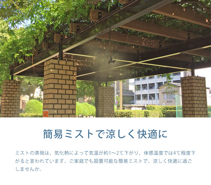 「簡易ミスト ハンガーセット」は上からノズルをぶら下げて散水するタイプで、庇(ひさし)やパーゴラなどに設置し散水することで、気化熱による周辺の冷却が行えます。