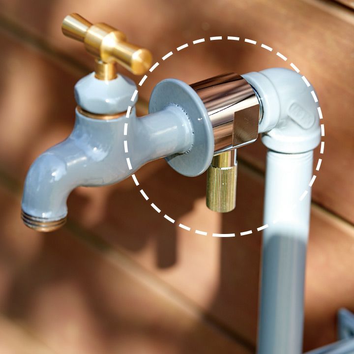 蓋を開くとシンクになる立水栓は、ちょっと不思議で可愛いカラクリがいっぱい!便利な「小物入れ」や「フック」が使う人の目線で工夫したポイント!ジューシーガーデンオリジナル。