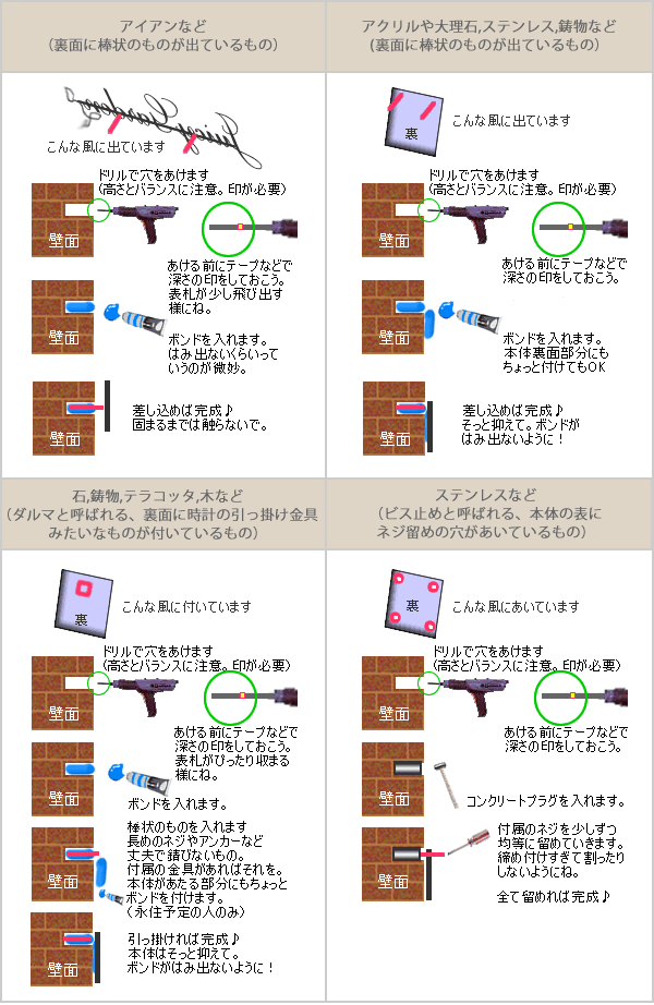 ※もちろんこの限りではありません。取付面が木製ならアイアンでもコンクリートプラグのようなものでドリル穴の径を調節する必要があったり(木ネジだけの時もある)、ボンドと両面テープで固定するだけのものもあります。取付面が平坦ではない場合や埋め込む場合は、取付部分を削って凹ませてからの設置になります。
