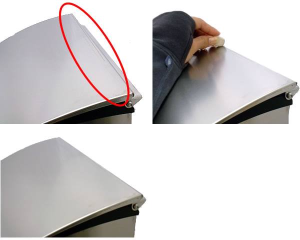 ステンレス面の保護シールが付いていたときの縁がスジのように残っている場合があります。その時、結構キレイに落とせるのが『消しゴム』です!コツはヘアラインに対して垂直方向にこする事。一度チャレンジしてみてください。(下記画像参照)