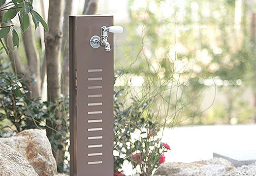 淡い色合いのナチュラルな立水栓たち。お庭に馴染む優しいデザインの水栓柱です。上部に植物ポット入れられたり、木目調やつる草い飾りのあるものなど可愛いものが増加中。