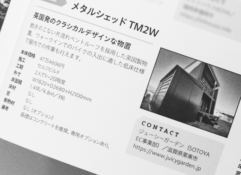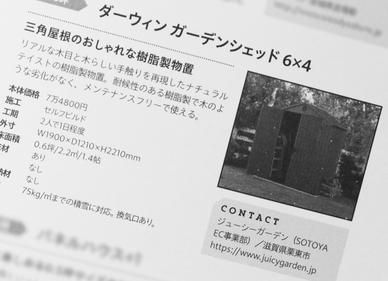 2025.09.30 小屋 小さな家の豊かな暮らし vol.13(2025年9月30日)に掲載されました メディア掲載 Tweet Share この記事のタイトルとURLをコピーする 2025年9月30日発行の「小屋 小さな家の豊かな暮らし vol.13」にて、弊社の「ケター ダーウィン 6×4」「メタルシェッド TM2W」について掲載いただきました。商品はJUICYGARDENショッピングサイトの各商品販売ページにてご覧ください。 ケター ダーウィン 6×4 メタルシェッド TM2W Tweet Share この記事のタイトルとURLをコピーする 大型パラソル&カフェチェア、テーブルセット(Future RESORT 様) 前の記事