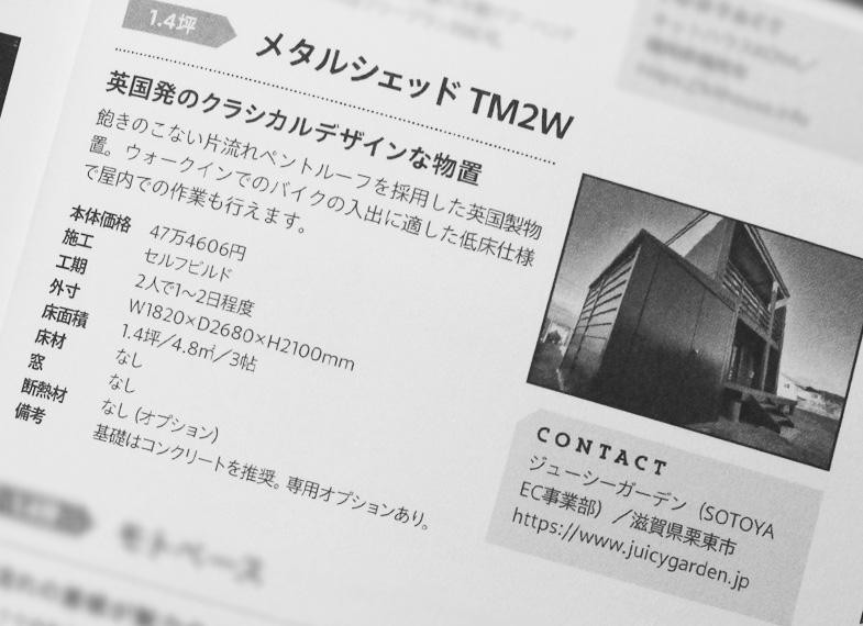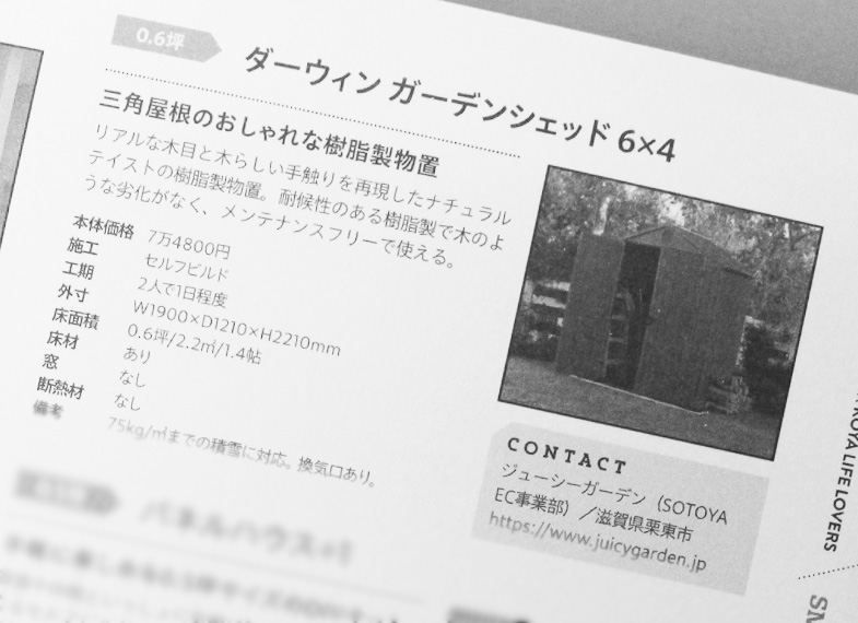 2026.03.30 小屋 小さな家の豊かな暮らし vol.14(2026年3月30日)に掲載されました メディア掲載 Tweet Share この記事のタイトルとURLをコピーする 2026年3月30日発行の「小屋 小さな家の豊かな暮らし vol.14」にて、弊社の「ケター ダーウィン 6×4」「メタルシェッド TM2W」について掲載いただきました。商品はJUICYGARDENショッピングサイトの各商品販売ページにてご覧ください。 ケター ダーウィン 6×4 メタルシェッド TM2W Tweet Share この記事のタイトルとURLをコピーする 郵便物だけじゃない!メール便や大型郵便物まで受取可能な優秀ポストをご紹介! 前の記事